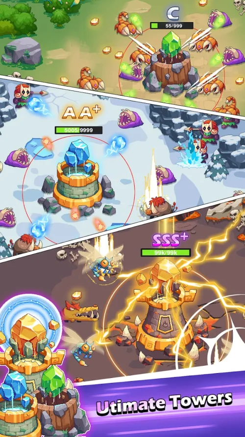 Battle waves of monsters in Pixel Defense MOD APK: Idle TD. Develop strategies and gain powerful upgrades to dominate all of the pixel worlds!