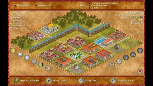 Romopolis MOD APK blends classic city-building mechanics with deep strategic planning. As the governor, you must carefully allocate space for residential buildings while ensuring proximity to essential services like bathhouses, markets, and theaters. Every decision impacts your reputation; happy citizens pay more rent and stay longer, whereas neglect can lead to a crumbling empire.