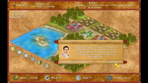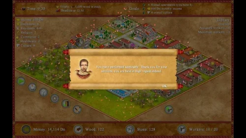 Build and manage your own Roman empire in Romopolis MOD APK! Master 24 unique scenarios, unlock 22 achievements, and create a thriving ancient city to earn glory.