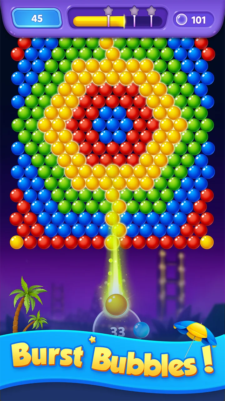 Match 3 or more bubbles of the same color to burst them. Chain reactions create massive blasts and higher scores. The more precise your aim, the bigger the reward!