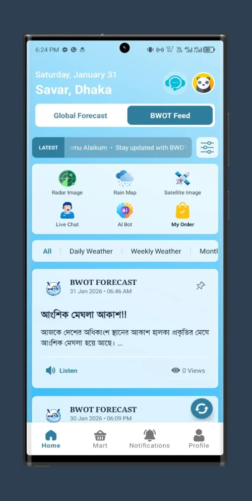 BWOT goes beyond basic forecasting by offering customizable alerts tailored to your location. Receive timely notifications about storms, temperature changes, or hazardous conditions so you can make informed decisions quickly. Whether you’re at home or traveling, BWOT keeps you connected to the latest weather updates worldwide.