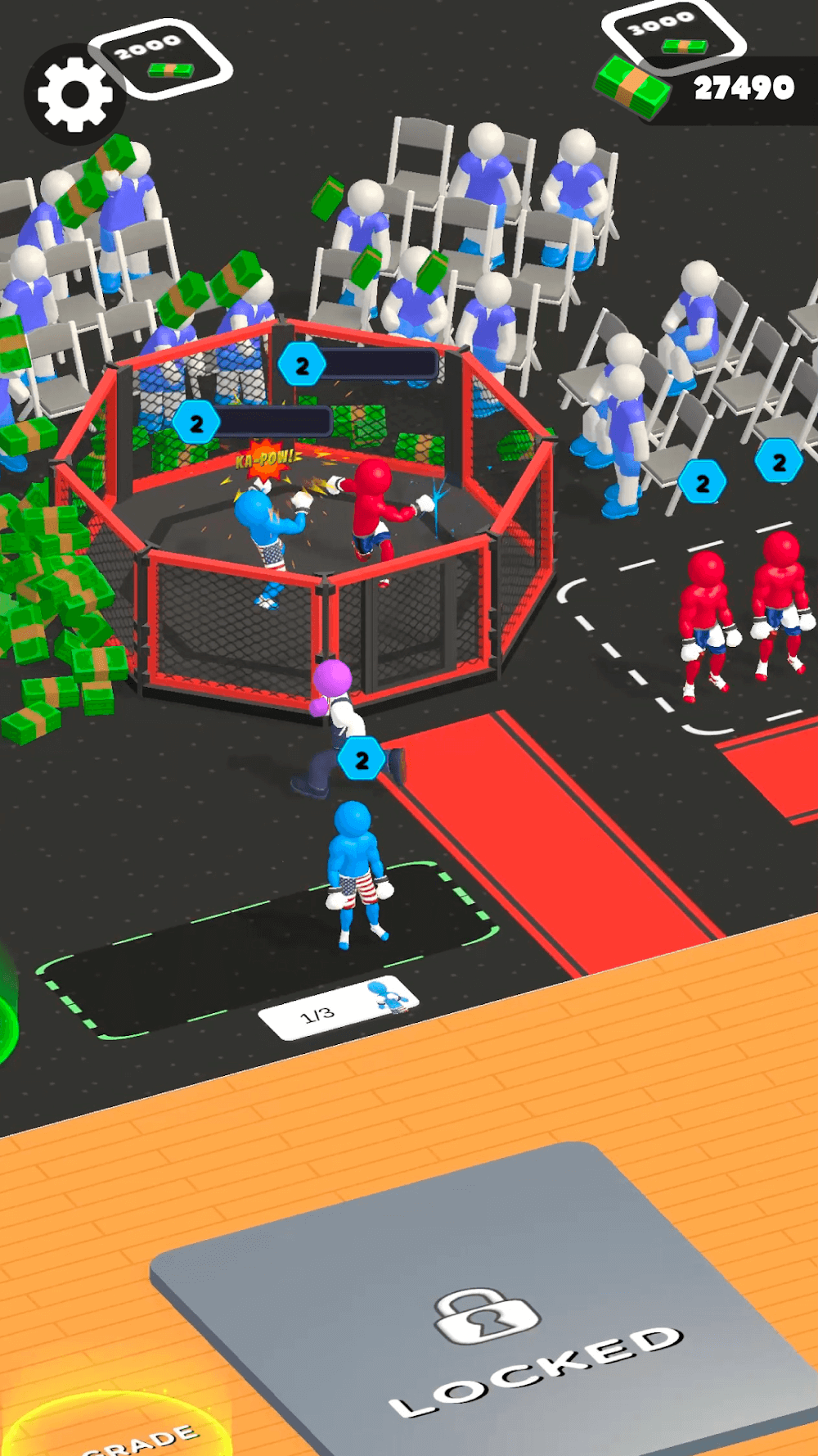 With each level, your fighters unlock a specialized zone that enhances speed, strength, and stamina. Once they reach goal, it is time for the main event: The Arena. Managing the crowd is as important as managing the fighters. When fighters dominate the cage, the crowd goes wild and rewards. Collect these to upgrade and unlock better training and faster equipment. The training and fighting loop will keep your gym and fighters winning!