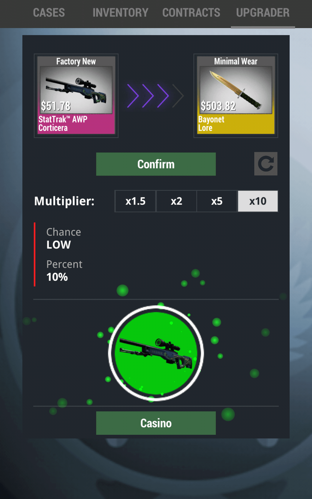 – Real Odds of Dropping: This game has real life equitability of outcomes! You’ll feel the excitement of winning one of the game’s best items! You’ll feel real joy if your game play includes a Factory New Covert item, Karambit, or M9 Bayonet.\• Trade-Up Contracts: If you have a ton of low tier skins, Blue or Purple, you can use the Trade-Up Contracts to trade ten of your items and get one higher tier item. Learn the strategy of putting in certain collections and see how your output gets manipulated.