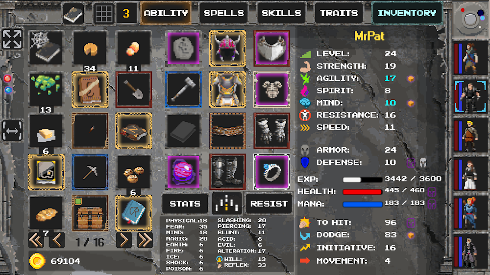 6 character capacity party, 65+ spells, 65+ abilities, 65+ traits, 50+ monsters, 40+ NPCs , 30+ quests, and 20+ areas to explore. Hundreds of items and tens of thousands of enchantment combinations make for all manner of powerful items.