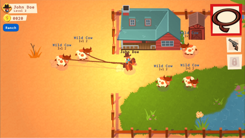 The main loop of the game challenges you to go out and wrangle some wyld steers, but don’t let your seats go sideways! Controlling the herd is the easy part. The hard part is bringing them back to your ranch without them getting lost, hurt, or eaten, as you navigate your way back to the ranch. Don’t forget to defend the herd against predators!