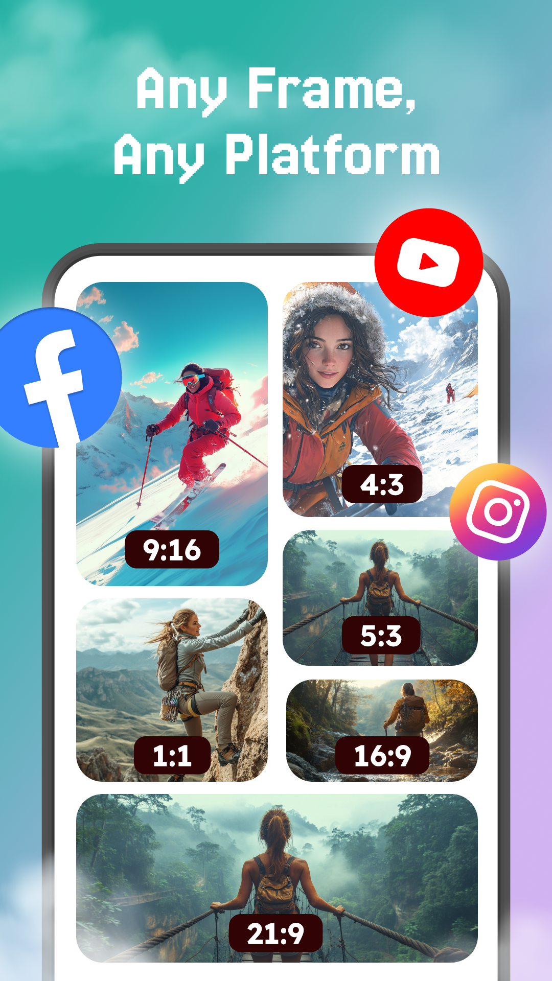 Easily crop videos into popular aspect ratios like 1:1, 9:16, 16:9, and custom sizes. Optimize your videos for Instagram, TikTok, Facebook, and YouTube with just one tap.