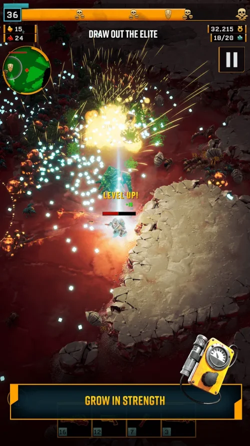The core of Deep Rock Galactic MOD APK: Survivor is built on a ‘Reverse Bullet Hell’ mechanic. Your weapons fire automatically, allowing you to focus on movement, mining, and strategic positioning. As you collect experience gems from fallen enemies, you will level up, choosing from a variety of random upgrades that increase your damage, reload speed, or movement.