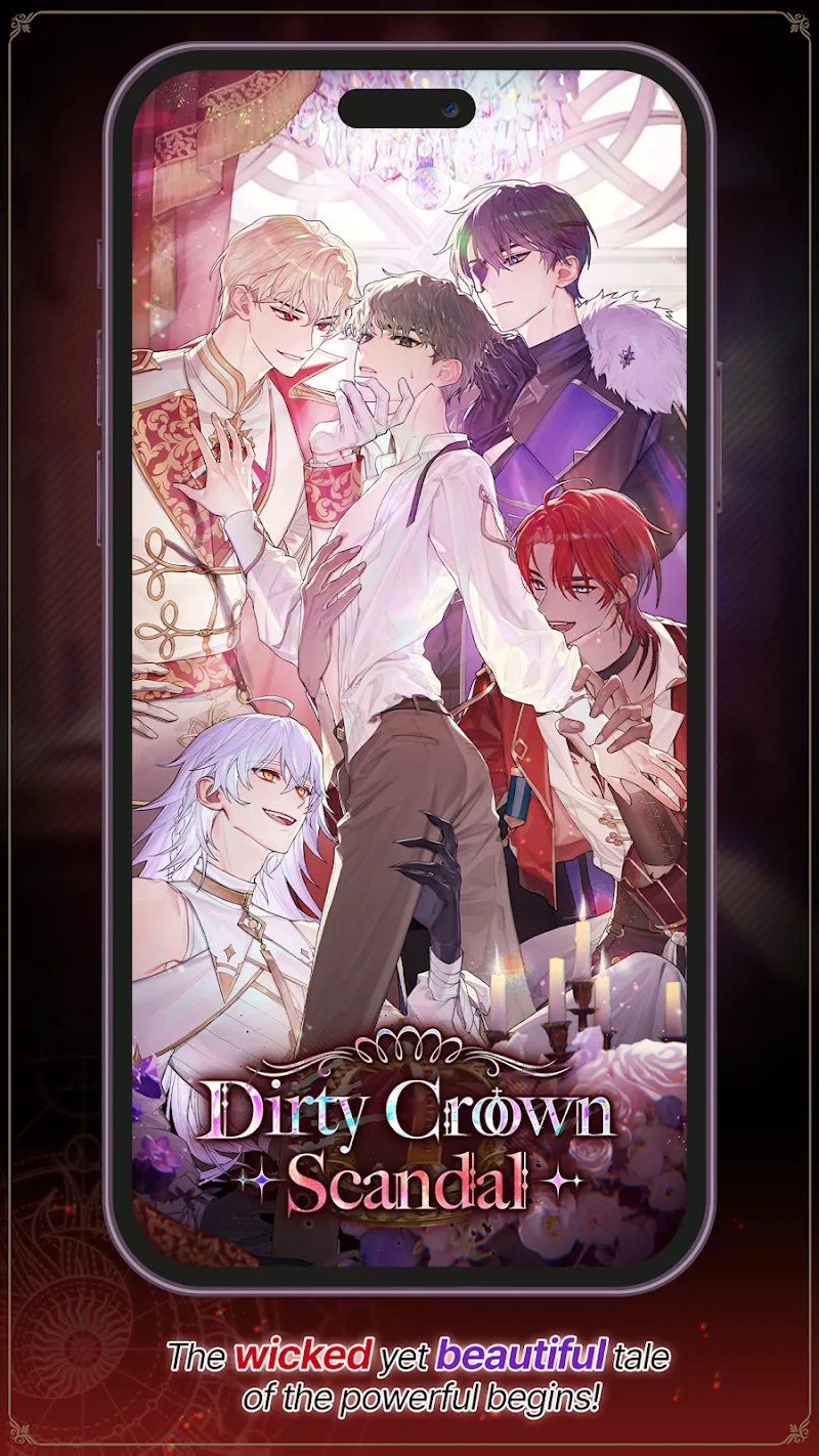 Uncover royal secrets in Dirty Crown Scandal! Navigate a world of fantasy BL romance, make life-altering choices, and capture the hearts of four enigmatic men.