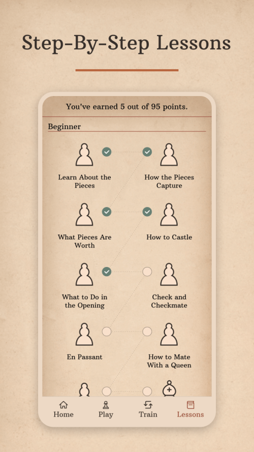 You will encounter different types of tactical exercises: puzzles, and various other types. Each challenge or exercise will reward you with an instruction. Players will face a sample of human-level playing.