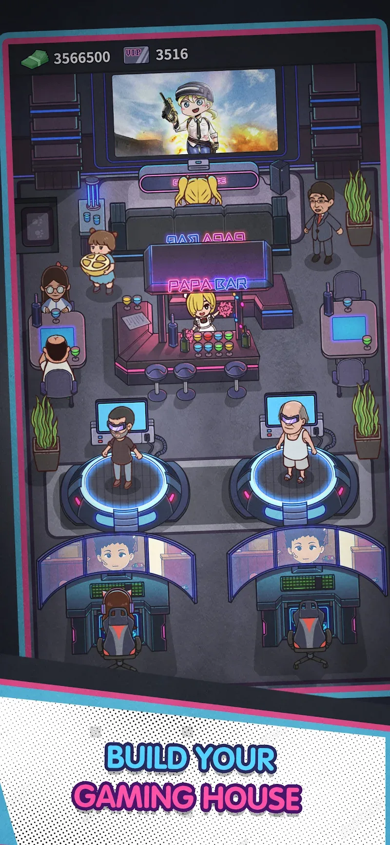 Construct the best internet cafe and manage everything! Create a unique layout for the gamers VIP experience and expand your business empire with this exciting tycoon simulation game.