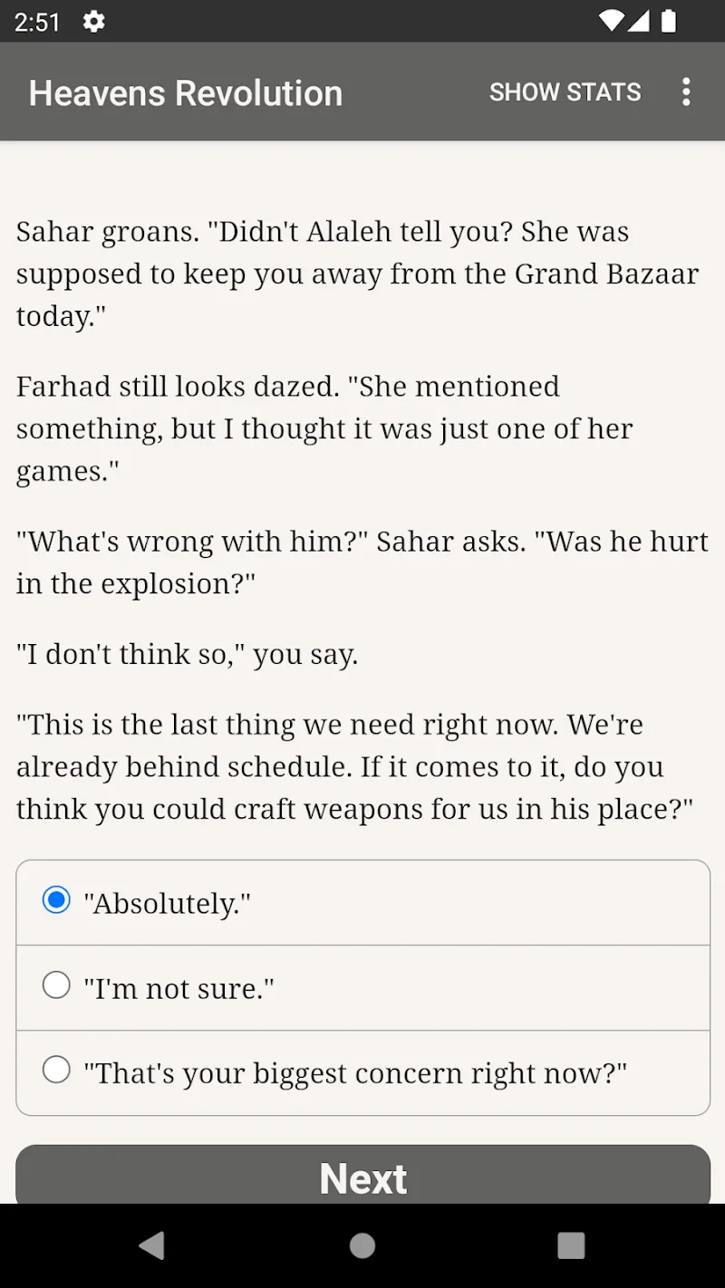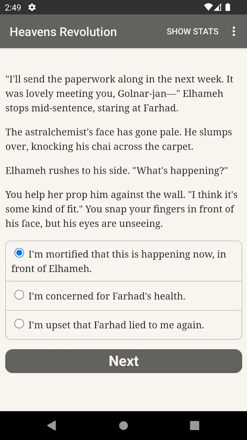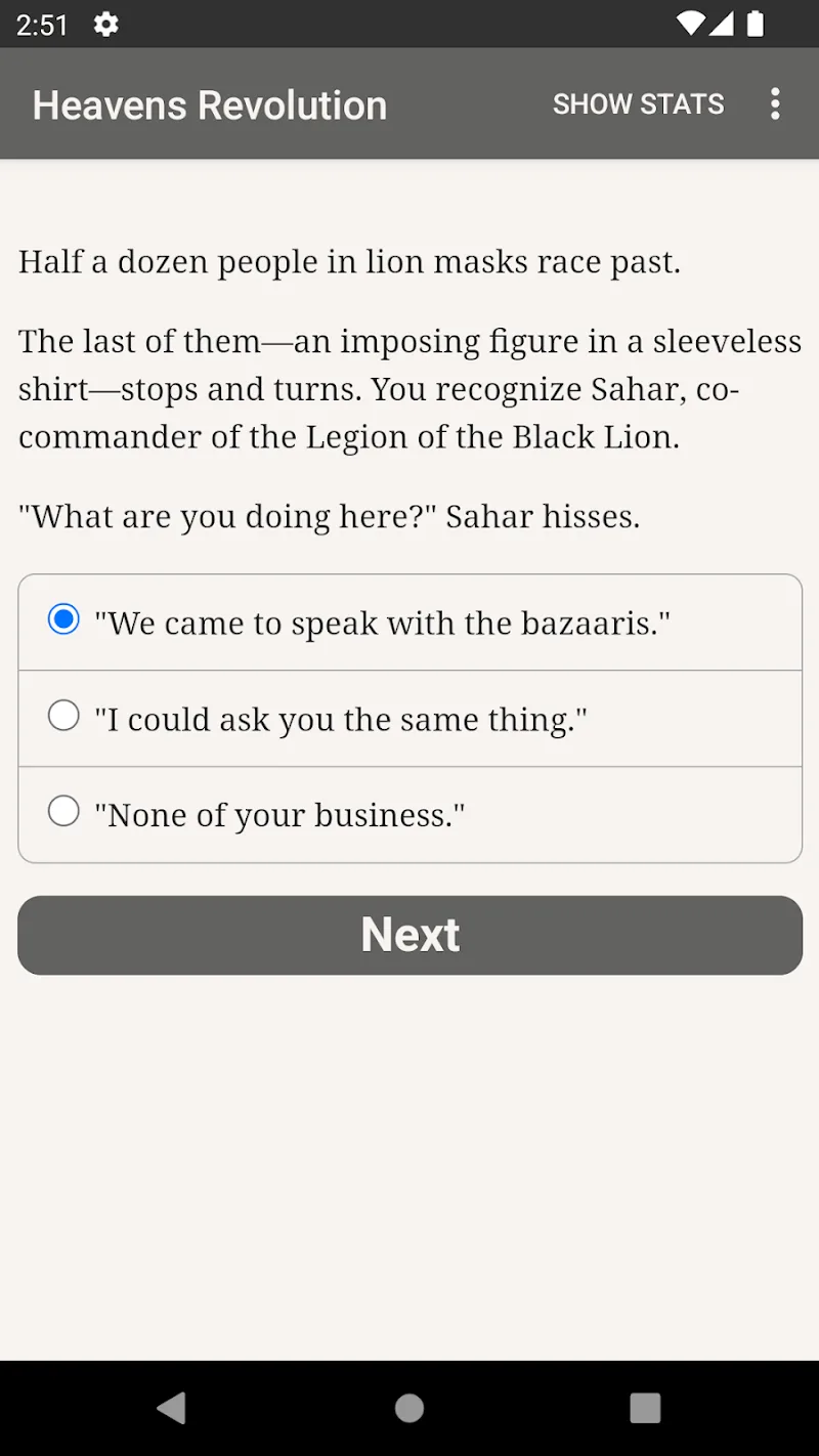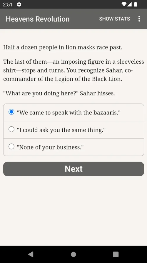 Dynamic Choose Your Own Adventure Style Stories: In Heaven Revolutions the story is developed behind every decision you make. Each task you undertake is accompanied by the option of developing one of the factions: the Royalists or the Satrapes.