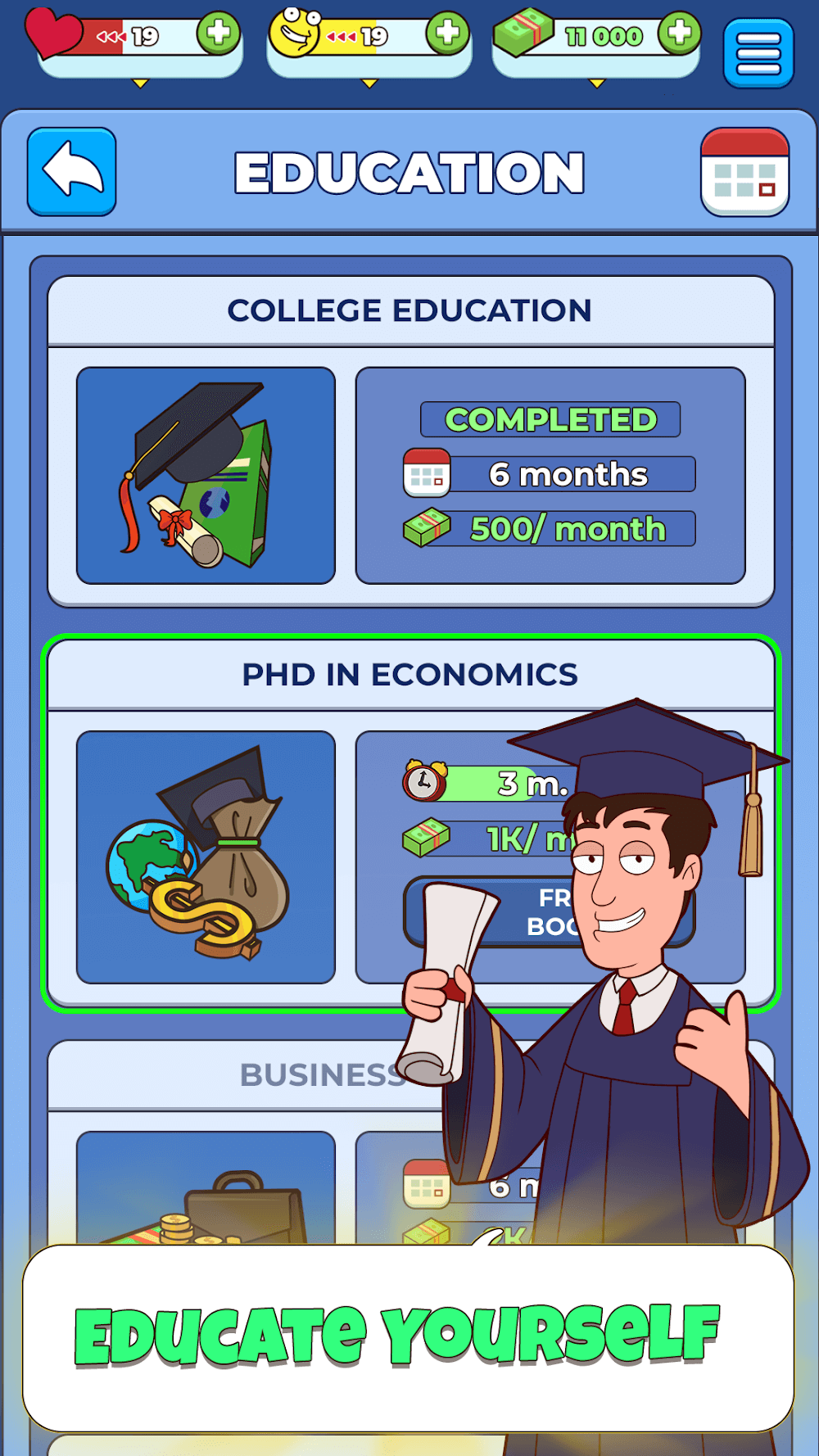 • Dynamic Career Paths: Start at the bottom with entry-level jobs and work your way up. Study hard to gain new skills, earn degrees, and unlock prestigious career opportunities that lead to massive wealth.
