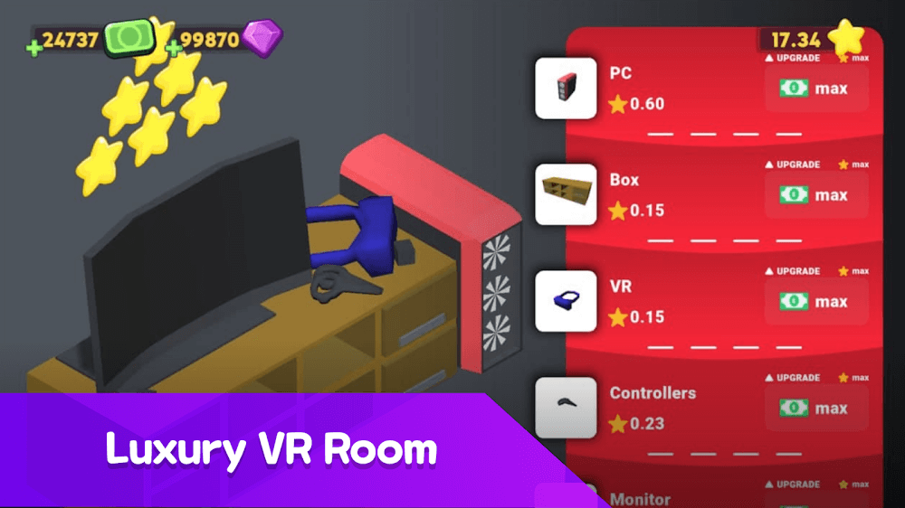 Internet Cafe Creator Idle MOD APK combines idle progression and strategy gaming. As a general manager, you will have to maintain your equipment and then you can upgrade your employees to do tasks. Hire staff so you can do the fun things like strategy. The more stars, the more elite your cafe will be. You can earn money while offline.
