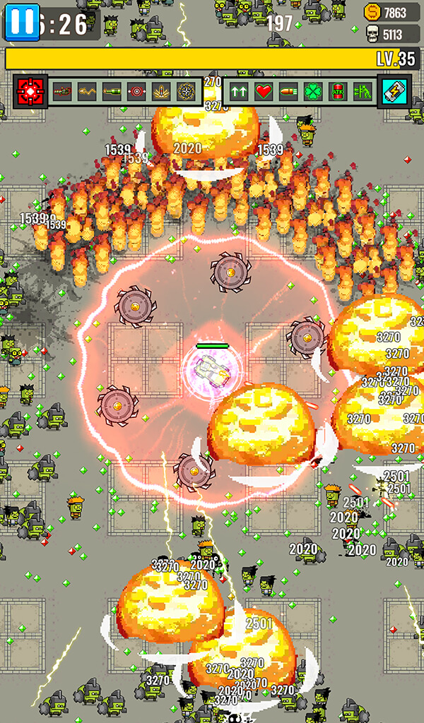 As you progress through the levels, you will face continuous waves of zombie attacks that increase in difficulty. To survive, you must collect experience gems dropped by fallen enemies to level up mid-run. Each level-up presents you with a choice of random upgrades, creating a unique roguelike experience every time you play. Will you pick the shield to survive a hit, or the drone to increase your damage output? Every decision counts in this intense battle for survival.