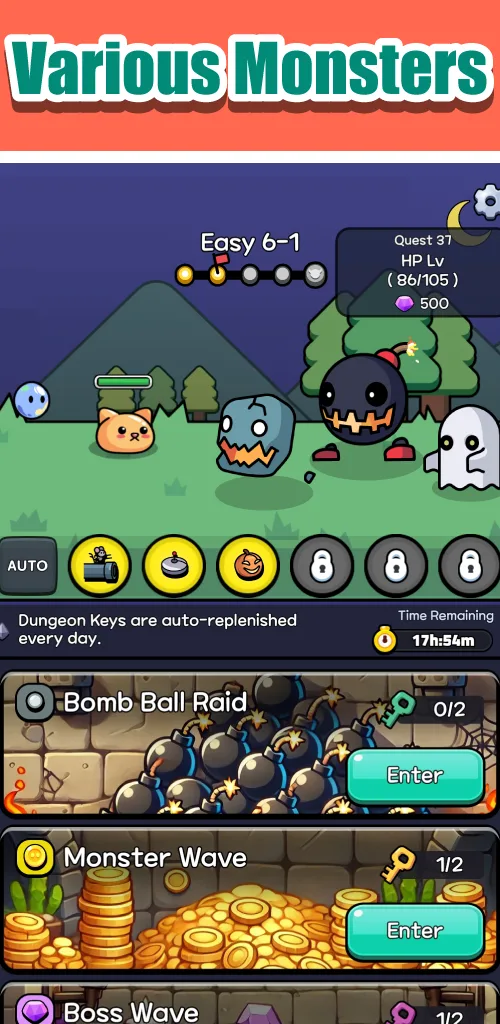 The action and strategy blend in JellyCat: Idle RPG is on point. The pinball combat mechanics is a welcomed deviation from the standard turn-based battle style. Running through the environment to bounce on monsters to deal damage, activate mega combos, and trigger cat skills is enjoyable.