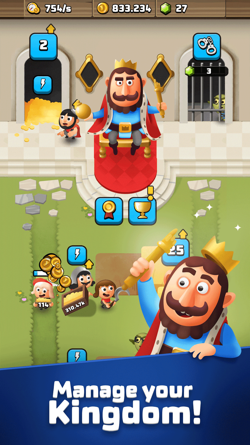 Grow your empire, direct heroes, and defeat dungeons in King Royale MOD APK: Idle Tycoon! Control your resources and expand your empire into a dominantly successful kingdom.