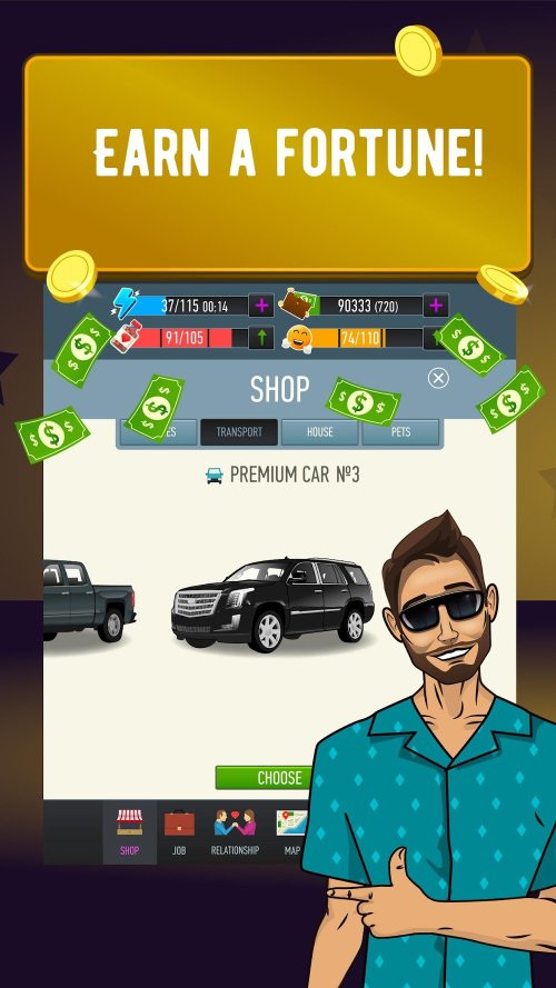 - Rise from Rags to Riches: Experience the ultimate underdog story. Start your journey with nothing and strategically navigate your way through life’s challenges to become a billionaire tycoon.