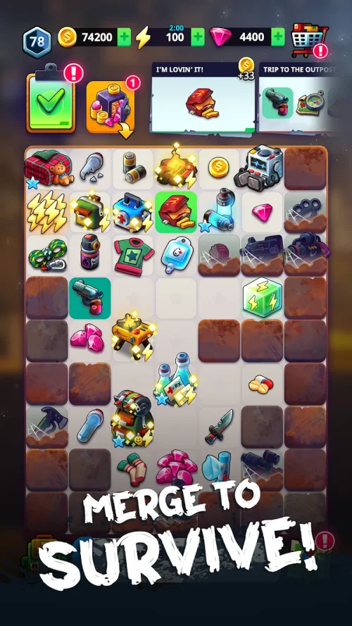 In Merge 2 Survive MOD APK, the core experience revolves around a highly satisfying and tactical merging system. Players start with basic components on a grid-based board. By dragging and combining identical pieces, you evolve them into more powerful versions. Need a more effective way to clear a path? Merge basic scrap metal until you forge a lethal weapon. Running low on energy? Merge basic rations into a hearty meal. Strategy is paramount—you must manage your limited grid space efficiently while ensuring you have the right tools ready for the next wave of zombies. As you progress, you will engage in tactical encounters where your merged equipment determines your success. The game perfectly integrates RPG elements, allowing you to level up Mia’s capabilities and adapt your strategy to face increasingly intelligent and dangerous undead threats.