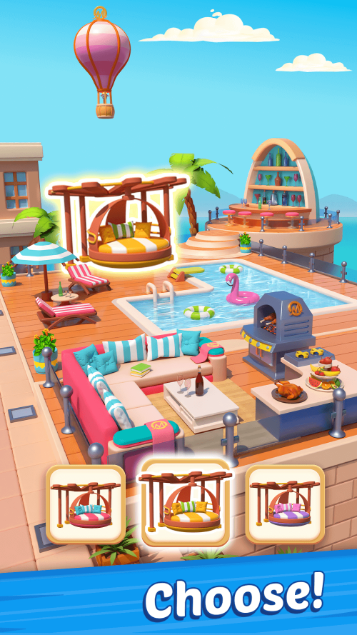 Use your hard-earned rewards to tackle renovation tasks. If you are developing the Pool Side BBQ, you will perform tasks like filling the pool, setting up swing seats, installing planters, and placing designer sofas. Each choice is yours, allowing you to attract more customers with a cool, beautiful interior and exterior. As you progress, you will unlock advanced products like Sushi and Nori Rice Balls, keeping the puzzle-solving experience fresh and rewarding.