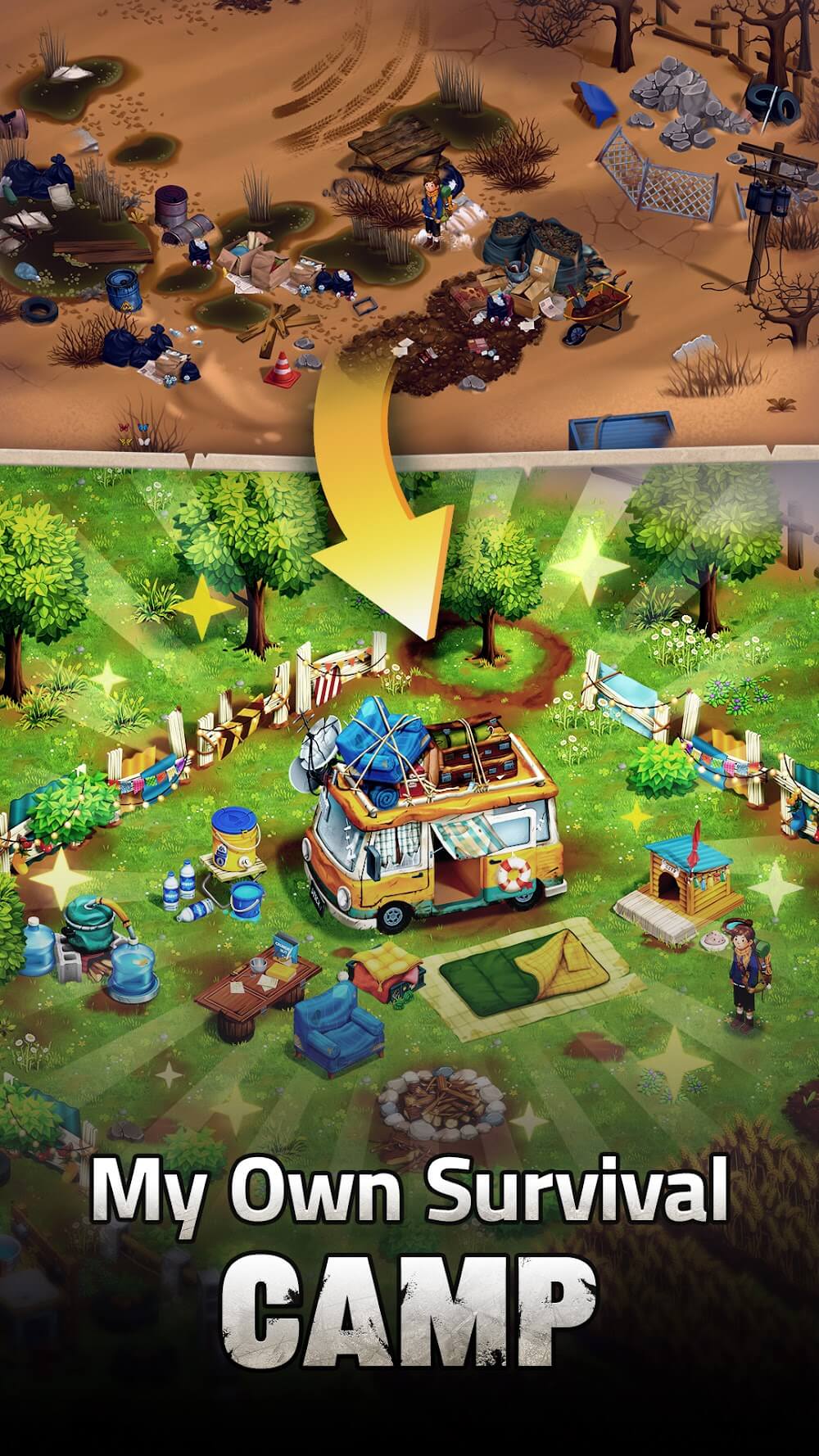Rebuild society after the apocalypse! Merge resources to survive, build an eco-friendly camp, and explore a wasteland full of secrets. Join the journey now!