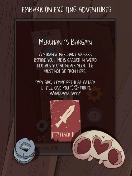 In Meteorfall MOD APK: Journeys, you choose from a roster of unique heroes, each with their own distinct deck and playstyle. From the stalwart warrior Bruno to the arcane master Greybeard, your choice of hero determines your path to victory. As you traverse the procedurally generated map, you will encounter quirky monsters, mysterious shrines, and greedy shopkeepers. Every decision is made with a simple swipe: swipe right to act, or swipe left to skip and recover. This high-stakes journey demands careful resource management and strategic foresight.