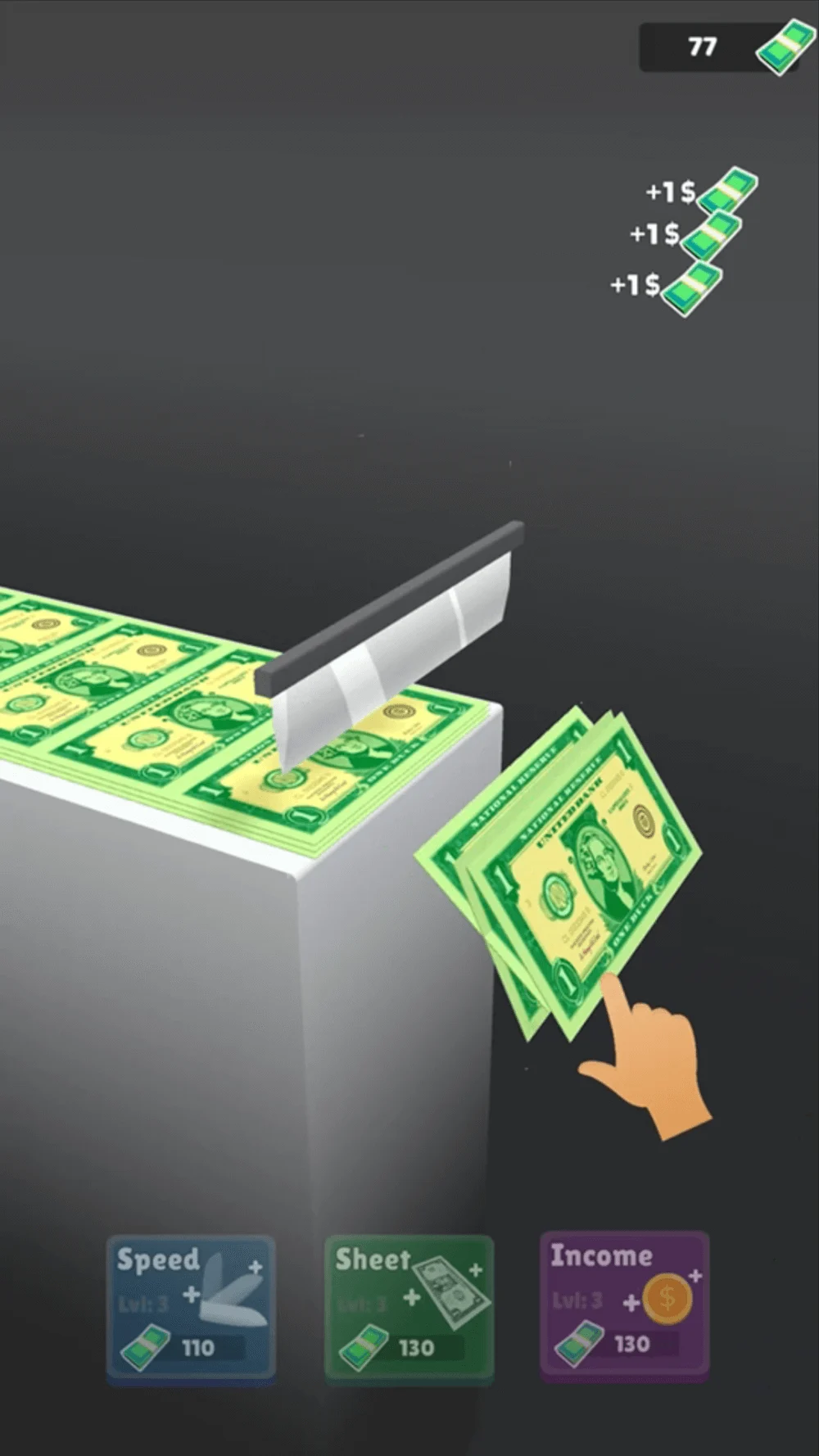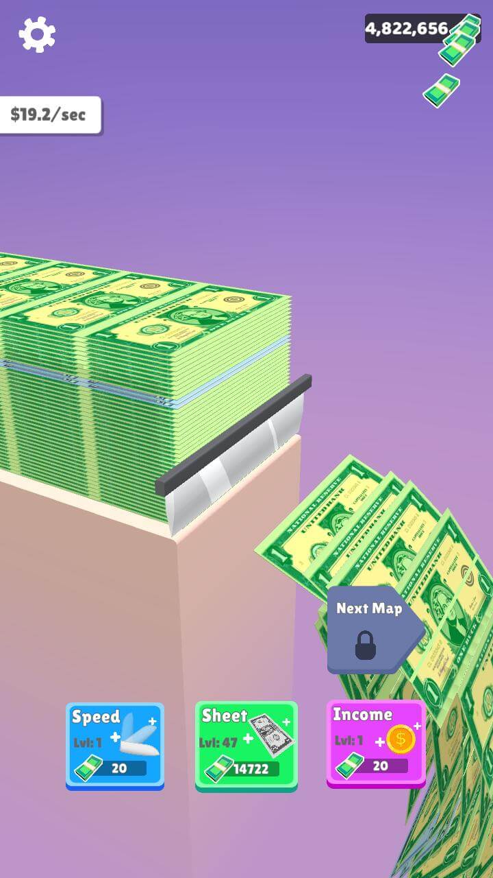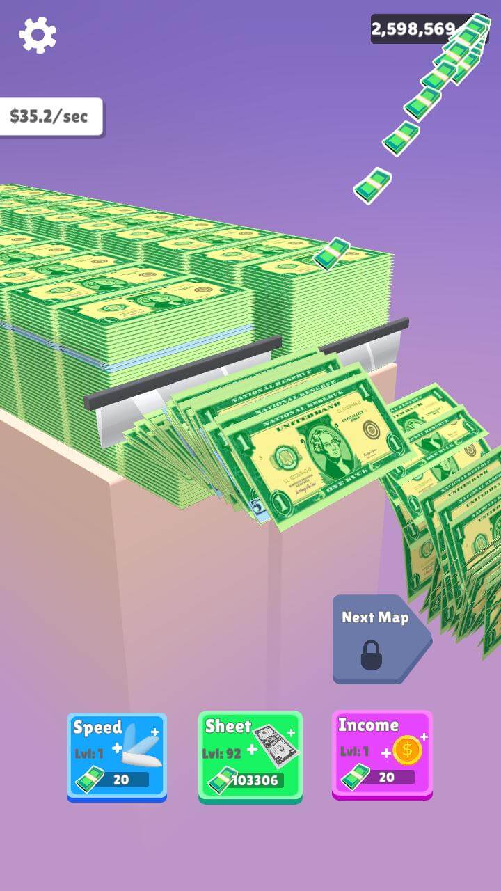 The best part of the game is the \”Make It Rain\” phase where all of your machines are running at full capacity and you are met with a cash storm and you have to think quickly about how much cash you can manage. You will have to make choices about whether to enhance your current machines to produce higher denomination bills or conquer new grounds to generate income. The game allows you to level up your character which means you\’re advancing your \”Tycoon Status\” and unlocking higher tiers of wealth and status.