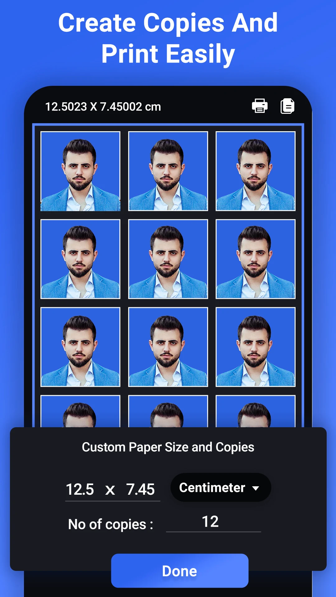 Save time and money by printing your photos at home or at a local photo center. The app generates print-ready sheets in standard paper sizes, allowing you to print multiple copies on a single page. You can also export high-resolution digital files for online submissions.