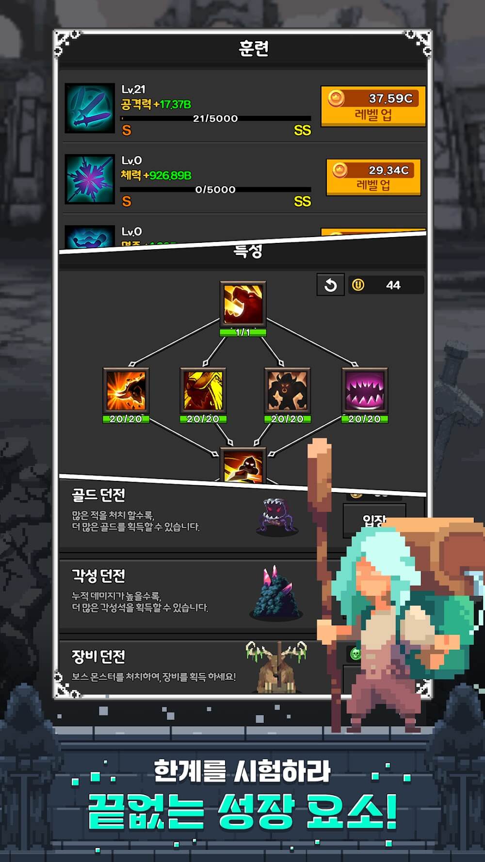 Since the game has the incremental nature, you’ll gain something after every session. Even just five minutes of upgrading your character, you’ll gain a power leap. Take part in unique challenges and get some really awesome upgrades to your hunter. Get some rare artifacts. The world becomes tougher as you progress, but also allows for advanced strategies. The game really comes alive and so do you, with greater opportunities in the pixelated realm.