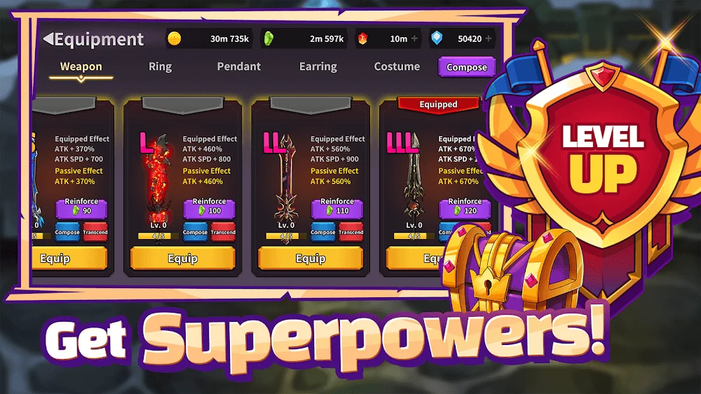 - Massive Equipment Collection: Explore over 60 different types of weapons and ornaments. Each piece of gear can be enhanced and merged to create even more powerful versions.