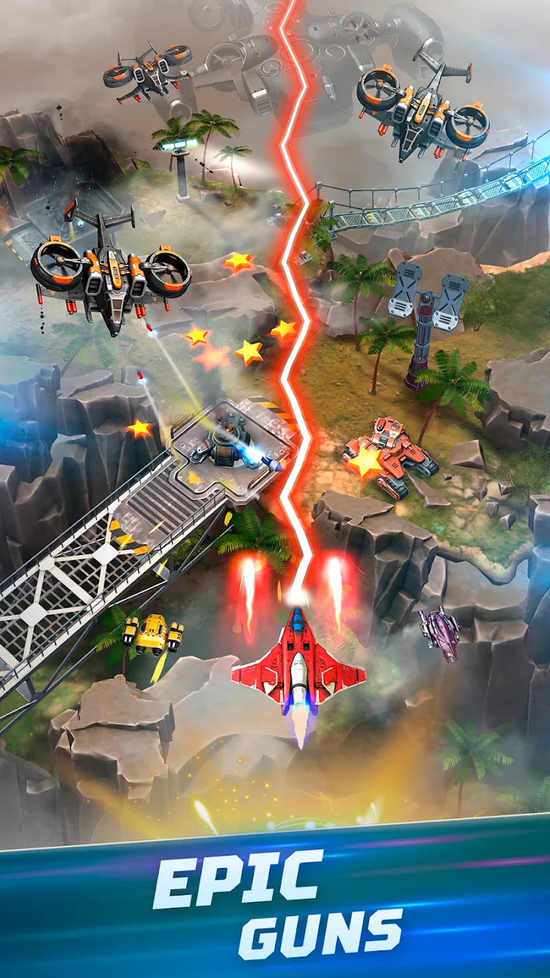 Red Hunt MOD APK takes the classic arcade shmup formula and elevates it with deep strategic elements. Spanning across numerous levels of varying difficulty, the game challenges both your reflexes and your tactical mind. You won’t just be shooting; you’ll be completing complex objectives, discovering hidden areas, and analyzing enemy patterns. Replaying missions allows you to master your maneuvers, earn stars, and gather essential resources needed for the war effort. With an expansive campaign featuring diverse locations—from neon-lit airfields to apocalyptic wastelands—Red Hunt MOD APK offers endless replayability and intense action.