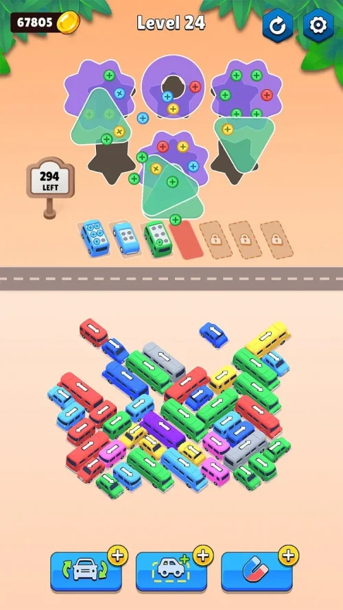 In Screw Pin Sort MOD APK, it’s not about speed, but the sequence of steps. Each level shows a parking lot where a number of levels are trapped by obstacles. to clear the padlock, you must remove screws, which are carried by the cars themselves. Each level serves as a mechanical puzzle, where if screws are removed in a bad sequence, the puzzle cannot be solved and becomes a lock even further. You must clear the screws and match the cars and screws according to the rules of the level.