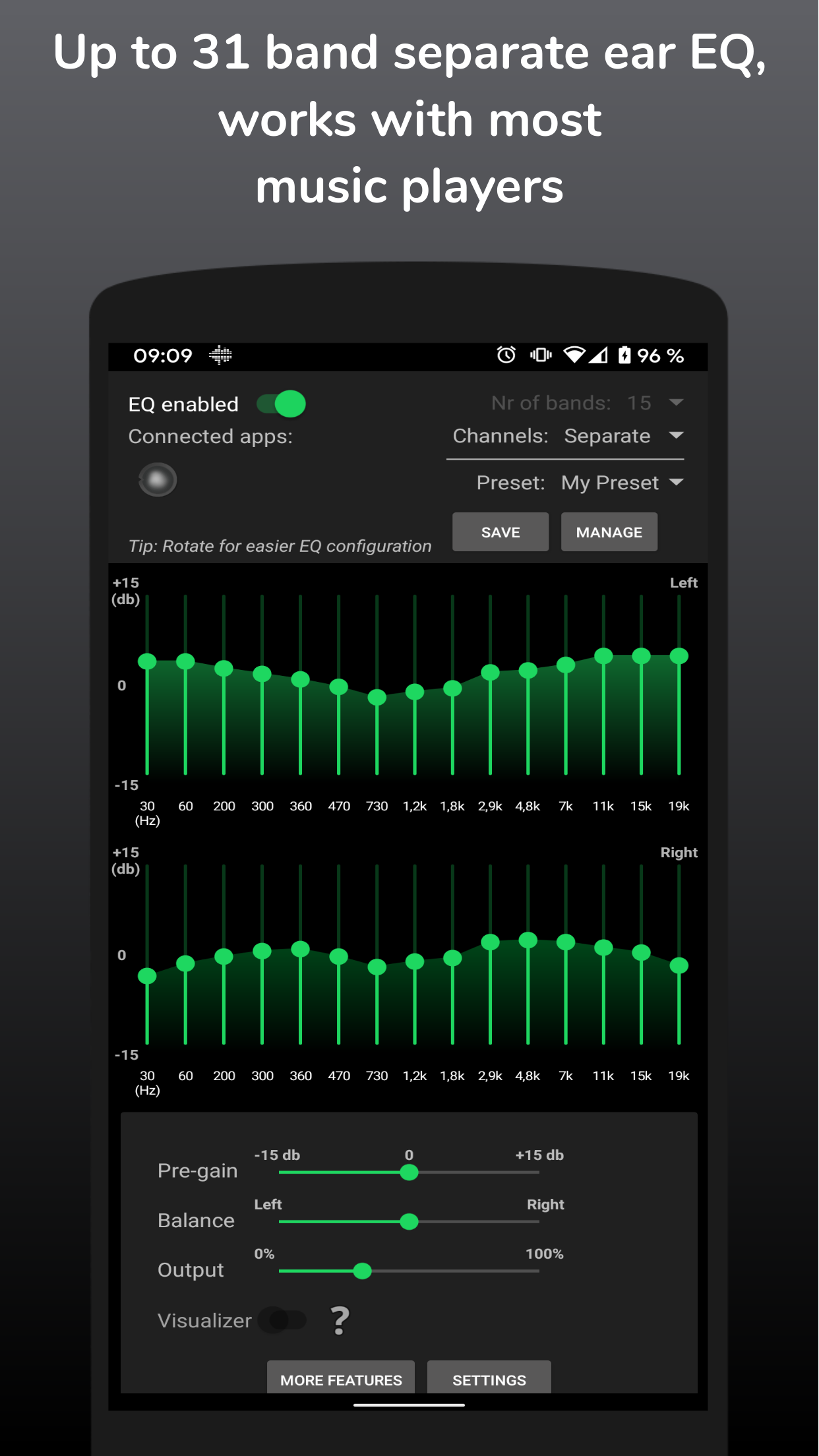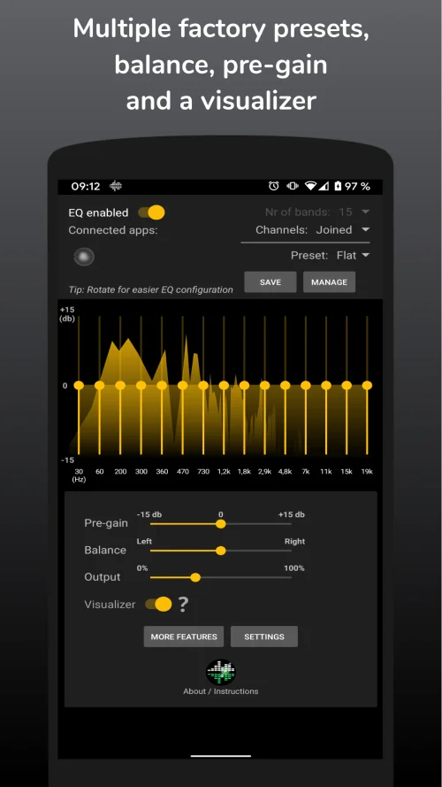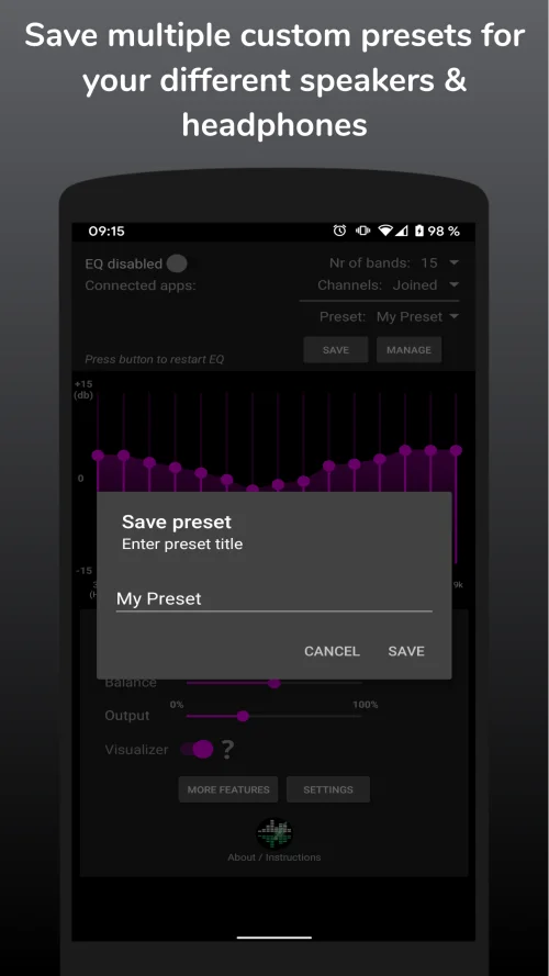 The app also allows you to save and manage custom presets, so you can instantly switch between different sound profiles for various environments, devices, or genres. For example, create one preset for headphones, another for car audio, and another for home speakers.