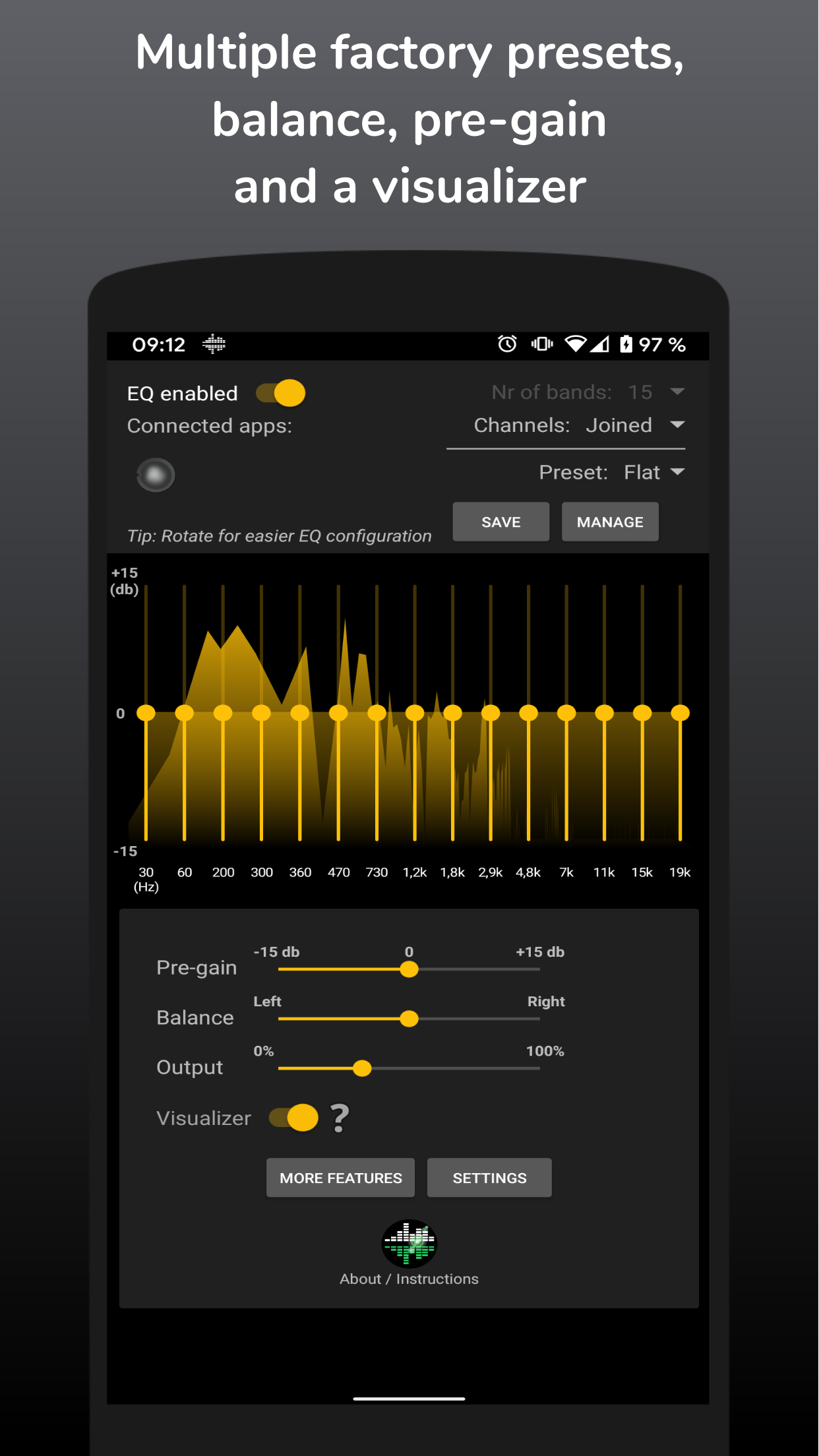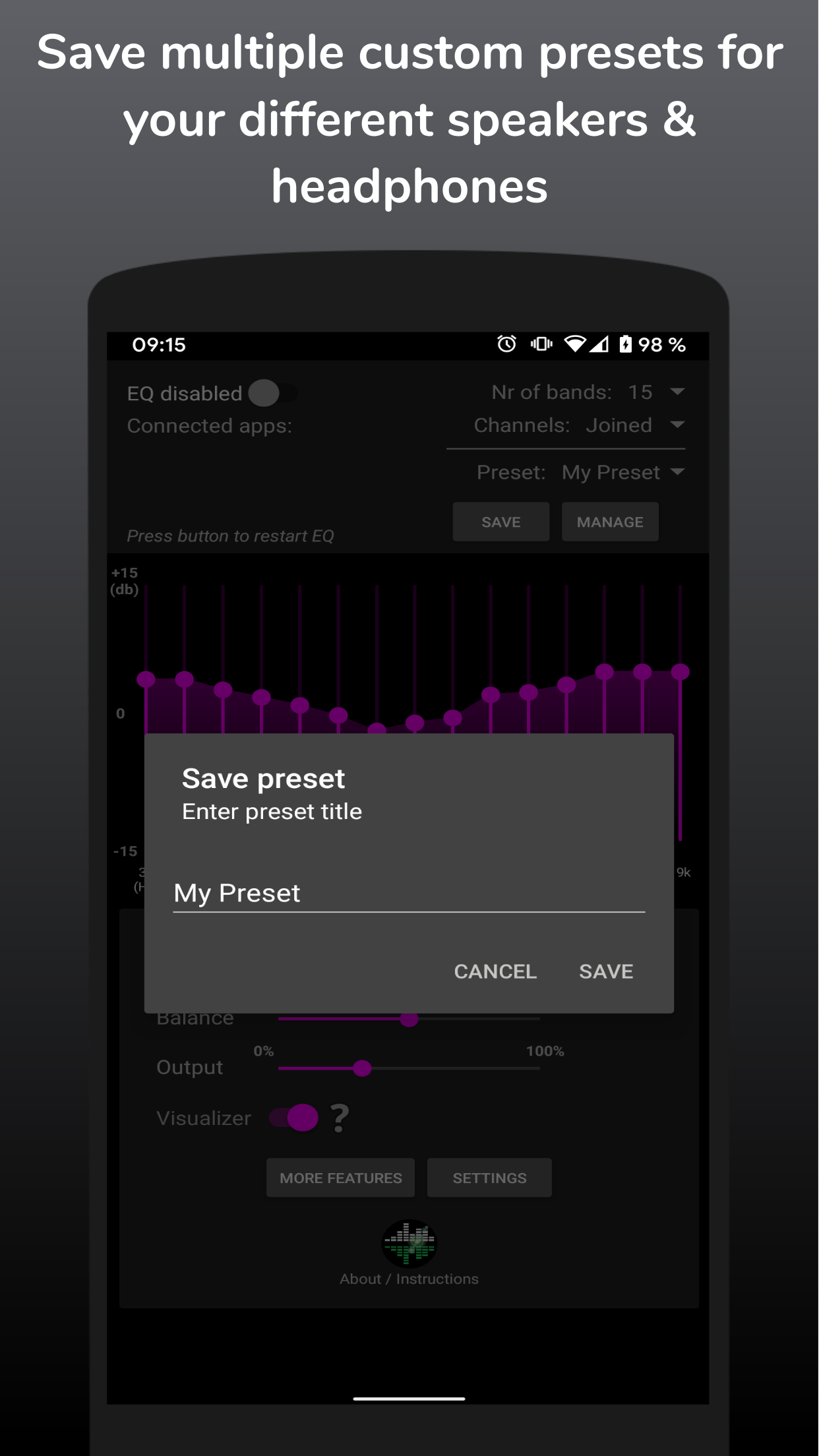 • Create and save custom equalizer presets